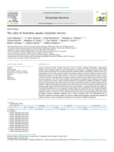 Aquatic ecosystems provide valuable ecosystem services to human wellbeing. Nonetheless, anthropogenic pressures cause significant impacts on their environment and biodiversity. Assigning economic value to these services increases awareness for ecosystem protection, informing policies and planning. Currently, there is no comprehensive review of the economic valuation of Australia's aquatic ecosystems, despite it having the world's third largest marine area. This study provides a review of the economic value of ecosystem services in seven aquatic ecosystems in Australia, namely: mangroves, saltmarsh, seagrass, kelp, shellfish reef, freshwater wetlands and open waterways. Over 90% of the economic value estimates in Australia were conducted for kelp, mangroves, saltmarsh and seagrass, whereas limited information was identified for shellfish reef habitats. Available research is concentrated in New South Wales and Victoria, with limited research in Western Australia and the Northern Territory. Provisioning and cultural services represented over 70% of researched ecosystem services in Australia, while habitat and biodiversity services were rarely identified. Typical provisioning and cultural services identified globally, such as raw materials or bequest values were not identified in the Australian literature. Australian economic values were typically below the global 50th percentile for provisioning, cultural and climate regulation services. In contrast, the use of aquatic ecosystems for storm and erosion protection are often one of the highest economic valuations worldwide with a median Australian value over $400,000/ha/year for mangrove, saltmarsh and seagrass habitats. Overall, the compiled results highlight a potential undervaluation of aquatic ecosystem services in Australia and important research gaps for further investigation.