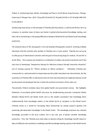 Pollock, A. Synthesizing Hope: Matter, Knowledge and Place in South African Drug Discovery, Chicago: University of Chicago Press. 2019. 191 pp. $82.50 (cloth) $27.50 (pbk) $10.00 to $27.50 (ebk) ISBN 978-0-226-62918-6.