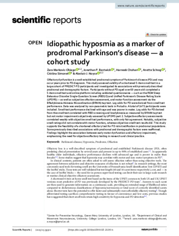 Idiopathic hyposmia as a marker of prodromal Parkinson's disease — a cohort study.