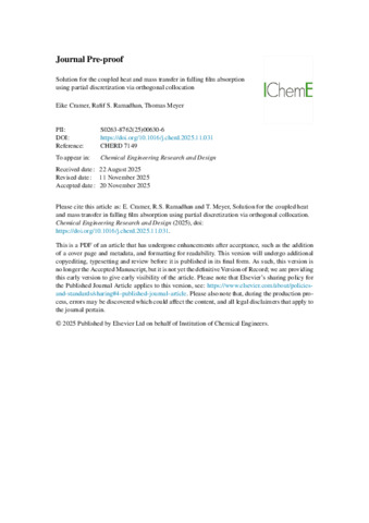 | Title: | Solution for the coupled heat and mass transfer in falling film absorption using partial discretization via orthogonal collocation |