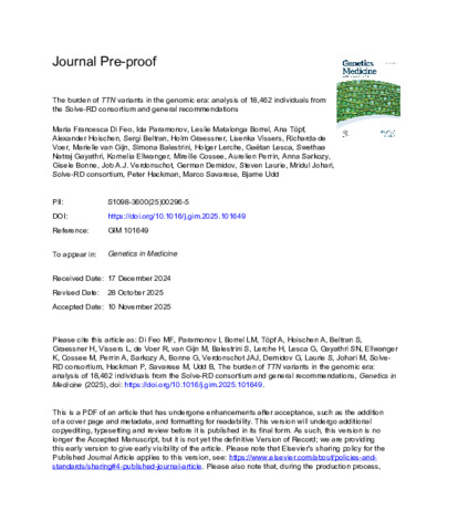 | Title: | The burden of TTN variants in the genomic era: analysis of 18,462 individuals from the Solve-RD consortium and general recommendations |