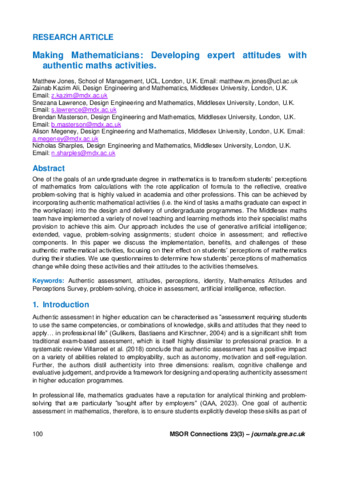 One of the goals of an undergraduate degree in mathematics is to transform students’ perceptions of mathematics from calculations with the rote application of formula to the reflective, creative problem-solving that is highly valued in academia and other professions. This can be achieved by incorporating authentic mathematical activities (i.e. the kind of tasks a maths graduate can expect in the workplace) into the design and delivery of undergraduate programmes. The Middlesex maths team have implemented a variety of novel teaching and learning methods into their specialist maths provision to achieve this aim. Our approach includes the use of generative artificial intelligence; extended, vague, problem-solving assignments; student choice in assessment; and reflective components. In this paper we discuss the implementation, benefits, and challenges of these authentic mathematical activities, focusing on their effect on students’ perceptions of mathematics during their studies. We use questionnaires to determine how students’ perceptions of mathematics change while doing these activities and their attitudes to the activities themselves.