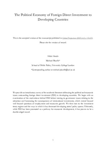 We provide an introductory survey of the academic literature addressing the political and economic issues surrounding foreign direct investment in developing countries. We begin with an examination of the motivations behind foreign direct investment before turning to governance issues relating to the attraction and harnessing the consequences of international investments, which extend well beyond questions of employment and economic growth. We then turn to the investment treaty regime and the ways in which it has decreased developing states’ policy spaces. Ultimately, while foreign direct investment has been promoted as a pathway for economic development, it has proven to be a double-edged sword.