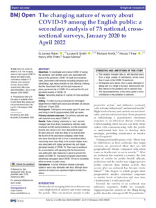 | Title: | The changing nature of worry about COVID-19 among the English public: a secondary analysis of 73 national, crosssectional surveys, January 2020 to April 2022 |