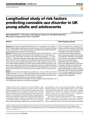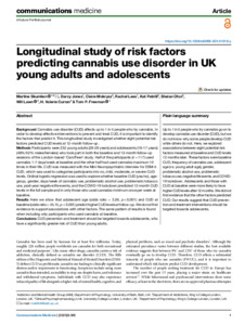 | Title: | Longitudinal study of risk factors predicting cannabis use disorder in UK young adults and adolescents |