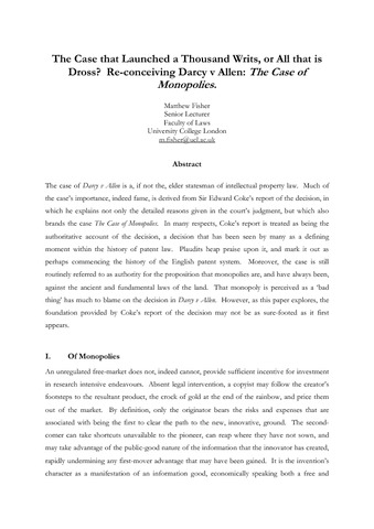 The case of Darcy v Allen is a, if not the, elder statesman of intellectual property law. Much of the case’s importance, indeed fame, is derived from Sir Edward Coke’s report of the decision, in which he explains not only the detailed reasons given in the court’s judgment, but which also brands the case The Case of Monopolies. In many respects, Coke’s report is treated as being the authoritative account of the decision, a decision that has been seen by many as a defining moment within the history of patent law. Plaudits heap praise upon it, and mark it out as perhaps commencing the history of the English patent system. Moreover, the case is still routinely referred to as authority for the proposition that monopolies are, and have always been, against the ancient and fundamental laws of the land. That monopoly is perceived as a ‘bad thing’ has much to blame on the decision in Darcy v Allen. However, as this paper explores, the foundation provided by Coke’s report of the decision may not be as sure-footed as it first appears.
