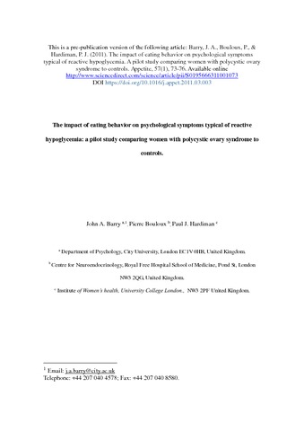 The impact of eating behavior on psychological symptoms typical of reactive hypoglycemia. A pilot study comparing women with polycystic ovary syndrome to controls.