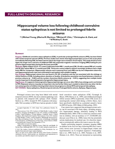 Title: | Hippocampal volume loss following childhood convulsive status epilepticus is not limited to prolonged febrile seizures. |