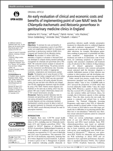 | Title: | An early evaluation of clinical and economic costs and benefits of implementing point of care NAAT tests for Chlamydia trachomatis and Neisseria gonorrhoea in genitourinary medicine clinics in England. |