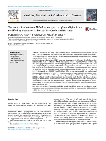 | Title: | The association between APOA5 haplotypes and plasma lipids is not modified by energy or fat intake: The Czech HAPIEE study. |