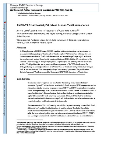 | Title: | The kinase p38 activated by the metabolic regulator AMPK and scaffold TAB1 drives the senescence of human T cells |