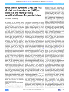 | Title: | Fetal alcohol syndrome (FAS) and fetal alcohol spectrum disorder (FASD) - diagnosis and moral policing; an ethical dilemma for paediatricians |