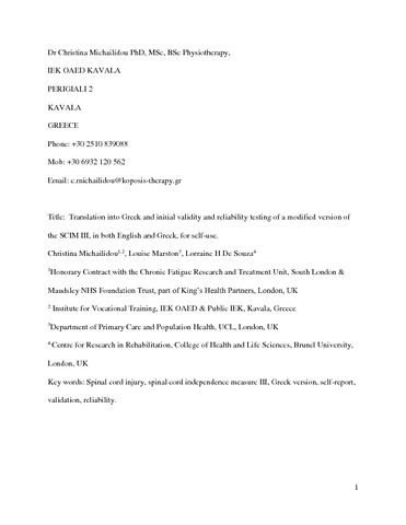 Title: | Translation into Greek and initial validity and reliability testing of a modified version of the SCIM III, in both English and Greek, for self-use |
