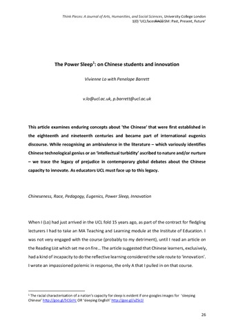 This article examines enduring concepts about 'the Chinese' that were first established in the eighteenth and nineteenth centuries and became part of international eugenics discourse. While recognising an ambivalence in the literature – which variously identifies Chinese technological genius or an ‘intellectual turbidity’ ascribed to nature and/or nurture – we trace the legacy of prejudice in contemporary global debates about the Chinese capacity to innovate. As educators UCL must face up to this legacy.