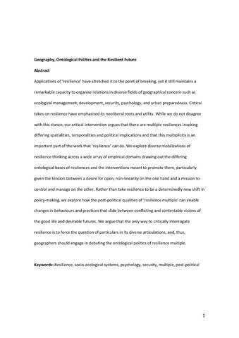 Applications of ‘resilience’ have stretched it to the point of breaking, yet it still maintains a remarkable capacity to organise relations in diverse fields of geographical concern such as ecological management, development, security, psychology, and urban preparedness. Critical takes on resilience have emphasised its neoliberal roots and utility. While we do not disagree with this stance, our critical intervention argues that there are multiple resiliences invoking differing spatialities, temporalities and political implications and that this multiplicity is an important part of the work that ‘resilience’ can do. We explore diverse mobilizations of resilience thinking across a wide array of empirical domains drawing out the differing ontological bases of resiliences and the interventions meant to promote them, particularly given the tension between a desire for open, non-linearity on the one hand and a mission to control and manage on the other. Rather than take resilience to be a determinedly new shift in policy-making, we explore how the post-political qualities of ‘resilience multiple’ can enable changes in behaviours and practices that slide between conflicting and contestable visions of the good life and desirable futures. We argue that the only way to critically interrogate resilience is to force the question of particulars in its diverse articulations, and, thus, geographers should engage in debating the ontological politics of resilience multiple.
