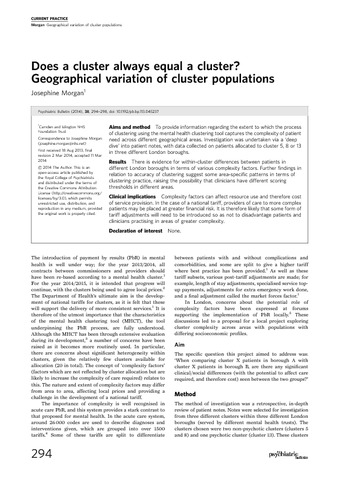 Aims and method To provide information regarding the extent to which the process of clustering using the mental health clustering tool captures the complexity of patient need across different geographical areas. Investigation was undertaken via a 'deep dive' into patient notes, with data collected on patients allocated to cluster 5, 8 or 13 in three different London boroughs. Results There is evidence for within-cluster differences between patients in different London boroughs in terms of various complexity factors. Further findings in relation to accuracy of clustering suggest some area-specific patterns in terms of clustering practice, raising the possibility that clinicians have different scoring thresholds in different areas. Clinical implications Complexity factors can affect resource use and therefore cost of service provision. In the case of a national tariff, providers of care to more complex patients may be placed at greater financial risk. It is therefore likely that some form of tariff adjustments will need to be introduced so as not to disadvantage patients and clinicians practising in areas of greater complexity.