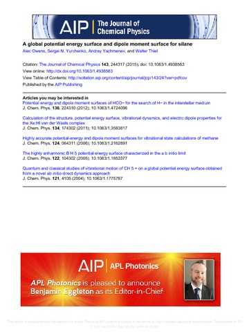 | Additional information: | Copyright 2015 AIP Publishing. This article may be downloaded for personal use only. Any other use requires prior permission of the author and AIP Publishing. The following article appeared in Owens, A; Yurchenko, SN; Yachmenev, A; Thiel, W; (2015) A global potential energy surface and dipole moment surface for silane. Journal of Chemical Physics , 143 (24) 10.1063/1.4938563 and may be found at http://dx.doi.org/10.1063/1.4938563 |