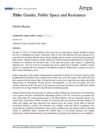 On May 27, 2013 at 11:30 pm bulldozers drove into Gezi, a central park in Taksim, Istanbul, to uproot five trees in preparation for future construction. Plans for the redevelopment had been announced two years before by the Prime Minister, Recep Tayyip Erdogan, and in response, two local activist groups had been formed: 'Taksim Solidarity' and the 'Society for the Preservation and Beautification of Gezi Park'. Founded to to publicise the historical status of the park and protect what remains a symbolically important site - and one of the few recreation areas in the central area of Istanbul - members of these groups were amongst the first to protest as the bulldozers rolled in. Within hours, a group of twenty to thirty activists had begun a sit-in. In the coming days, as the number of demonstrators increased to hundreds, the 'resistance' spread to other neighbourhoods in Istanbul. It also manifest itself in other cities across the country. The small scale sit-in that commenced in the night of May 27th had become a catalyst for a nationwide movement with global repercussions. It subsequently became known, interchangeably, as the Gezi movement, the Gezi resistance and Gezi events. The space of the protests was no longer bounded by Gezi Park itself, and the movement was no longer limited to a specific and local planning agenda. Taking criticism of the renovation plans for Taksim as their starting point, the protesters also raised their voices against what they considered the authoritarian policies of the the conservative government and, more specifically, the social pronouncements of the Prime Minister. The governmental response was violent police intervention. Within a month, five protesters and one policeman had died, hundreds of others were injured, and many protestors were arrested across the country. In the midst of what the government defined as anarchy and subversive acts, multiple social and cultural assumptions were overturned and, in Deleuze and Guattari's terms, events and behaviours were deterritiorialized. Transient actions in established spaces smoothed the striated spaces of government planning and, equally significantly, a radical and momentary reconceptualisation of gendered roles and spaces was established.