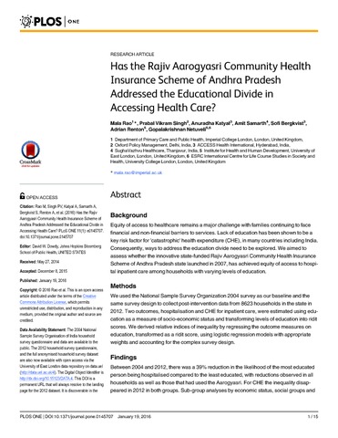 Title: | Has the Rajiv Aarogyasri Community Health Insurance Scheme of Andhra Pradesh Addressed the Educational Divide in Accessing Health Care? |
