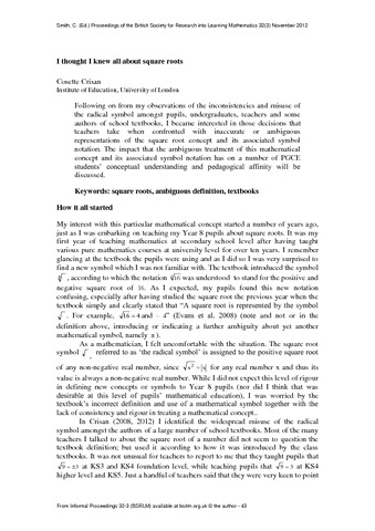 Following on from my observations of the inconsistencies and misuse of the radical symbol amongst pupils, undergraduates, teachers and some authors of school textbooks, I became interested in those decisions that teachers take when confronted with inaccurate or ambiguous representations of the square root concept and its associated symbol notation. The impact that the ambiguous treatment of this mathematical concept and its associated symbol notation has on a number of PGCE students’ conceptual understanding and pedagogical affinity will be discussed.