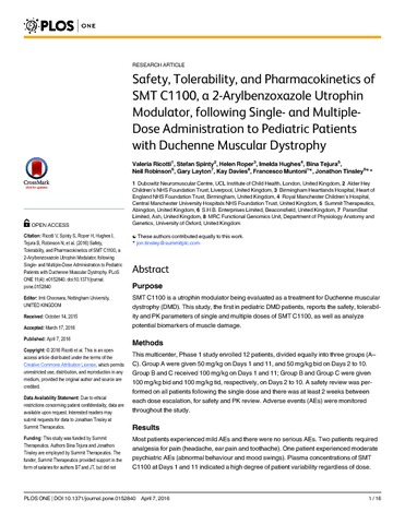 Safety, Tolerability, and Pharmacokinetics of SMT C1100, a 2-Arylbenzoxazole Utrophin Modulator, following Single- and Multiple-Dose Administration to Pediatric Patients with Duchenne Muscular Dystrophy.