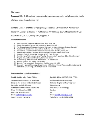 Lublin et al 2016 Oral fingolimod in primary progressive multiple sclerosis (INFORMS) - a phase 3, randomised, double-blind, placebo-controlled trial AAM.pdf Download (650kB) | Preview |