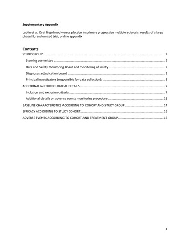 Lublin et al 2016 Oral fingolimod in primary progressive multiple sclerosis (INFORMS) - a phase 3, randomised, double-blind, placebo-controlled trial - Supplementary data.pdf Download (720kB) | Preview |