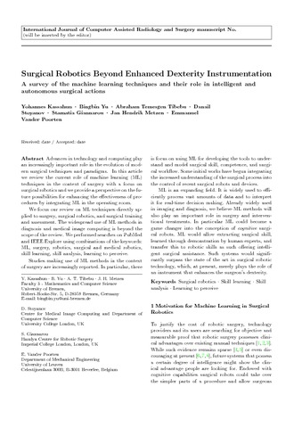 Title: | Surgical robotics beyond enhanced dexterity instrumentation: a survey of machine learning techniques and their role in intelligent and autonomous surgical actions |