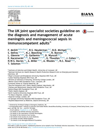 Title: | The UK joint specialist societies guideline on the diagnosis and management of acute meningitis and meningococcal sepsis in immunocompetent adults |