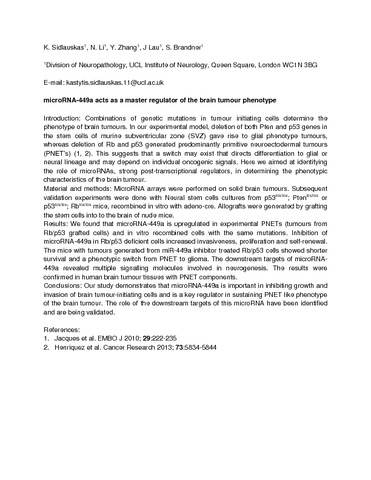 | Additional information: | This is the peer reviewed version of the following article: Sidlauskas, K; Li, N; Zhang, Y; Lau, J; Brandner, S; (2016) microRNA-449a acts as a master regulator of the brain tumour phenotype. Neuropathology and Applied Neurobiology, 42 (S1) pp. 44-45, which has been published in final form at: http://dx.doi.org/10.1111/nan.12307. This article may be used for non-commercial purposes in accordance with Wiley Terms and Conditions for Self-Archiving (http://olabout.wiley.com/WileyCDA/Section/id-828039.html#terms). |
