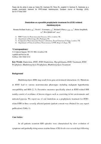 Additional information: | This is the peer reviewed version of the following article: Scalco, RS; Voermans, NC; Piercy, RJ; Jungbluth, H; Quinlivan, R; (2016) Dantrolene as a possible prophylactic treatment for RYR1-related rhabdomyolysis. European Journal of Neurology, 23 (8) e56-e57, which has been published in final form at: http://dx.doi.org/10.1111/ene.13051. This article may be used for non-commercial purposes in accordance with Wiley Terms and Conditions for Self-Archiving (http://olabout.wiley.com/WileyCDA/Section/id-828039.html#terms). |