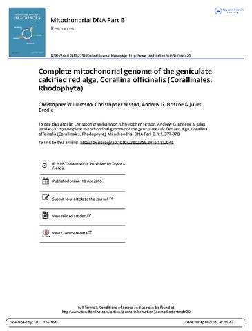 | Title: | Complete mitochondrial genome of the geniculate calcified red alga, Corallina officinalis (Corallinales, Rhodophyta) |