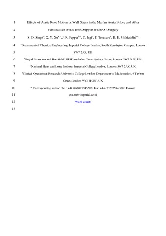 | Title: | Effects of aortic root motion on wall stress in the Marfan aorta before and after personalised aortic root support (PEARS) surgery |