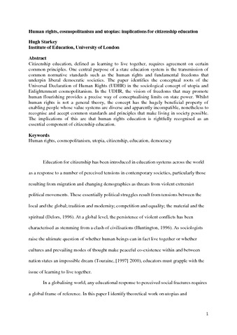 Title: | Human rights, cosmopolitanism and utopias: implications for citizenship education |