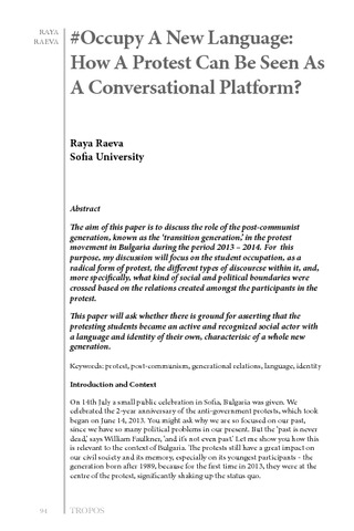 The aim of this paper is to discuss the role of the post-communist generation, known as the ‘transition generation,’ in the protest movement in Bulgaria during the period 2013 – 2014. For this purpose, my discussion will focus on the student occupation, as a radical form of protest, the different types of discourse within it, and, more specifically, what kind of social and political boundaries were crossed based on the relations created amongst the participants in the protest. This paper will ask whether there is ground for asserting that the protesting students became an active and recognized social actor with a language and identity of their own, characteristic of a whole new generation.
