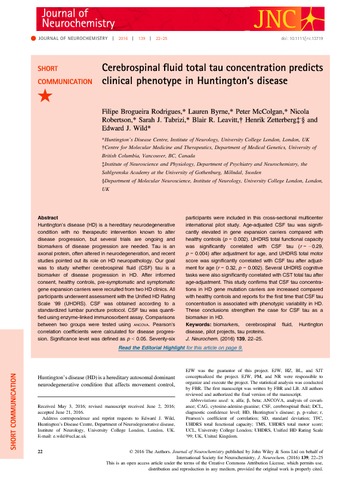 | Title: | Cerebrospinal fluid total tau concentration predicts clinical phenotype in Huntington's disease |