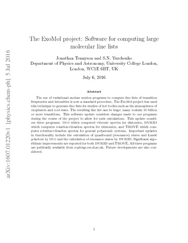 | Additional information: | © 2016 Wiley Periodicals, Inc.This is the peer reviewed version of the following article: Tennyson, J; Yurchenko, SN; (2017) The ExoMol project: Software for computing large molecular line lists. International Journal of Quantum Chemistry , 117 (2) pp. 92-103., which has been published in final form at 10.1002/qua.25190. This article may be used for non-commercial purposes in accordance with Wiley Terms and Conditions for Self-Archiving. |