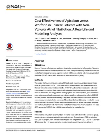Cost-Effectiveness of Apixaban versus Warfarin in Chinese Patients with Non-Valvular Atrial Fibrillation: A Real-Life and Modelling Analyses.