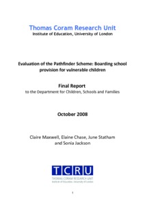 This is an evaluation report of the Boarding Provision for Vulnerable Children Pathfinder announced in the white paper 'Higher standards, better schools for all' (2005). The Pathfinder was intended to explore whether boarding school provision might be used to provide support, stability and improved life chances for a larger number of vulnerable children and young people. Ten local authorities and fifty boarding schools originally signed up to the Pathfinder. The Thomas Coram Research Unit at the Institute of Education, University of London, was commissioned to evaluate the scheme between December 2006 and October 2008. Findings included an analysis of the motivations of those authorities and schools involved; factors affecting selection and success in placements; the effectiveness of partnership working between schools and children's services; funding; and policy implications for local and central government. This is recommended reading for those in local authorities involved in placements for children and young people.