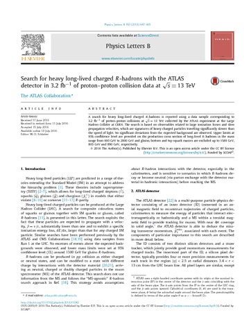| Title: | Search for heavy long-lived charged R-hadrons with the ATLAS detector in 3.2 fb(-1) of proton-proton collision data at root s=13 TeV |