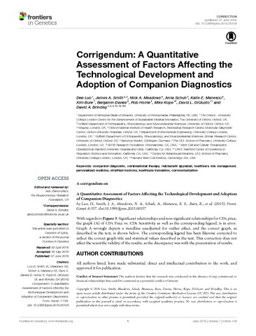 Title: | Corrigendum: A Quantitative Assessment of Factors Affecting the Technological Development and Adoption of Companion Diagnostics |