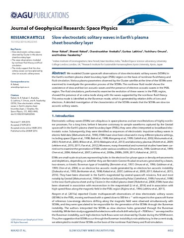 Additional information: | Copyright © 2016. American Geophysical Union. All Rights Reserved. This is the peer reviewed version of the following Kakad, A; Kakad, B; Anekallu, C; Lakhina, G; Omura, Y; Fazakerley, A; (2016) Slow electrostatic solitary waves in Earth's plasma sheet boundary layer. Journal of Geophysical Research: Space Physics , 121 (5) pp. 4452-4465. This article may be used for non-commercial purposes in accordance with Wiley Terms and Conditions for Self-Archiving, http://olabout.wiley.com/WileyCDA/Section/id-820227.html#terms |