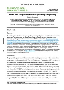 There is long-term (trophic) purinergic signalling involving cell proliferation, differentiation, motility and death in the development and regeneration of most systems of the body, in addition to fast purinergic signalling in neurotransmission, neuromodulation and secretion. It is not always easy to distinguish between short- and long-term signalling. For example, adenosine triphosphate (ATP) can sometimes act as a short-term trigger for long-term trophic events that become evident days or even weeks after the original challenge. Examples of short-term purinergic signalling during sympathetic, parasympathetic and enteric neuromuscular transmission and in synaptic transmission in ganglia and in the central nervous system are described, as well as in neuromodulation and secretion. Long-term trophic signalling is described in the immune/defence system, stratified epithelia in visceral organs and skin, embryological development, bone formation and resorption and in cancer. It is likely that the increase in intracellular Ca(2+) in response to both P2X and P2Y purinoceptor activation participates in many short- and long-term physiological effects.This article is part of the themed issue 'Evolution brings Ca(2+) and ATP together to control life and death'.