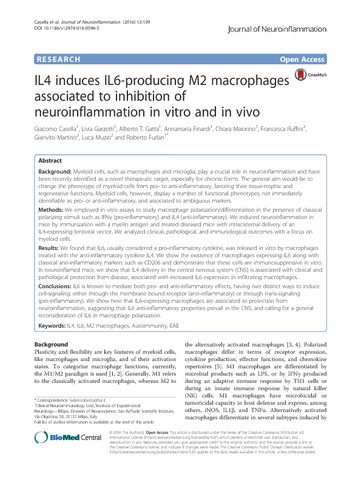 Title: | IL4 induces IL6-producing M2 macrophages associated to inhibition of neuroinflammation in vitro and in vivo |