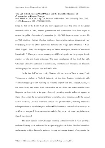 The Left Side of History: World War II and the Unfulfilled Promise of Communism in Eastern Europe. By KRISTEN GHODSEE. Pp. 256. Durham and London: Duke University Press. 2015. £15.99. Paperback. ISBN: 9780822358350.