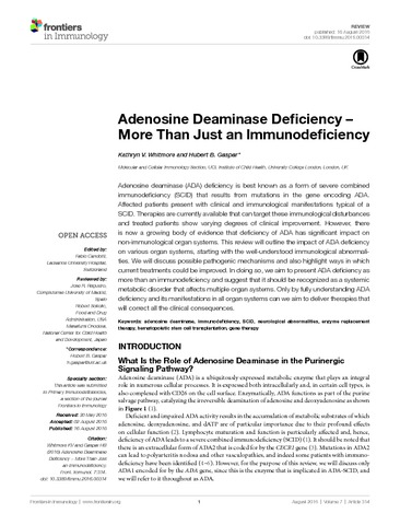 Adenosine deaminase (ADA) deficiency is best known as a form of severe combined immunodeficiency (SCID) that results from mutations in the gene encoding ADA. Affected patients present with clinical and immunological manifestations typical of a SCID. Therapies are currently available that can target these immunological disturbances and treated patients show varying degrees of clinical improvement. However, there is now a growing body of evidence that deficiency of ADA has significant impact on non-immunological organ systems. This review will outline the impact of ADA deficiency on various organ systems, starting with the well-understood immunological abnormalities. We will discuss possible pathogenic mechanisms and also highlight ways in which current treatments could be improved. In doing so, we aim to present ADA deficiency as more than an immunodeficiency and suggest that it should be recognized as a systemic metabolic disorder that affects multiple organ systems. Only by fully understanding ADA deficiency and its manifestations in all organ systems can we aim to deliver therapies that will correct all the clinical consequences.