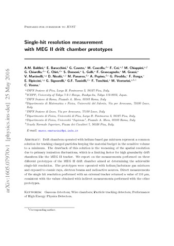 | Title: | Single-hit resolution measurement with MEG II drift chamber prototypes |
