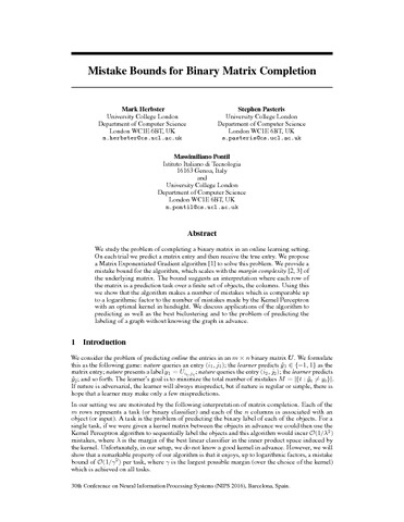 Title: | Mistake Bounds for Binary Matrix Completion |