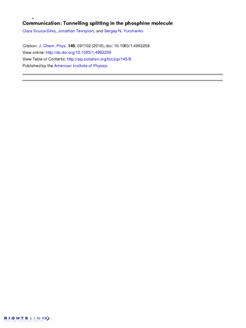 Additional information: | Published by AIP Publishing. This article may be downloaded for personal use only. Any other use requires prior permission of the author and AIP Publishing. The following article appeared in Sousa-Silva, C; Tennyson, J; Yurchenko, SN; (2016) Communication: Tunnelling splitting in the phosphine molecule. Journal of Chemical Physics , 145 (9) 10.1063/1.4962259 and may be found at http://doi.org/10.1063/1.4962259 |