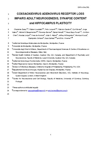 Coxsackievirus Adenovirus Receptor Loss Impairs Adult Neurogenesis, Synapse Content, and Hippocampus Plasticity.